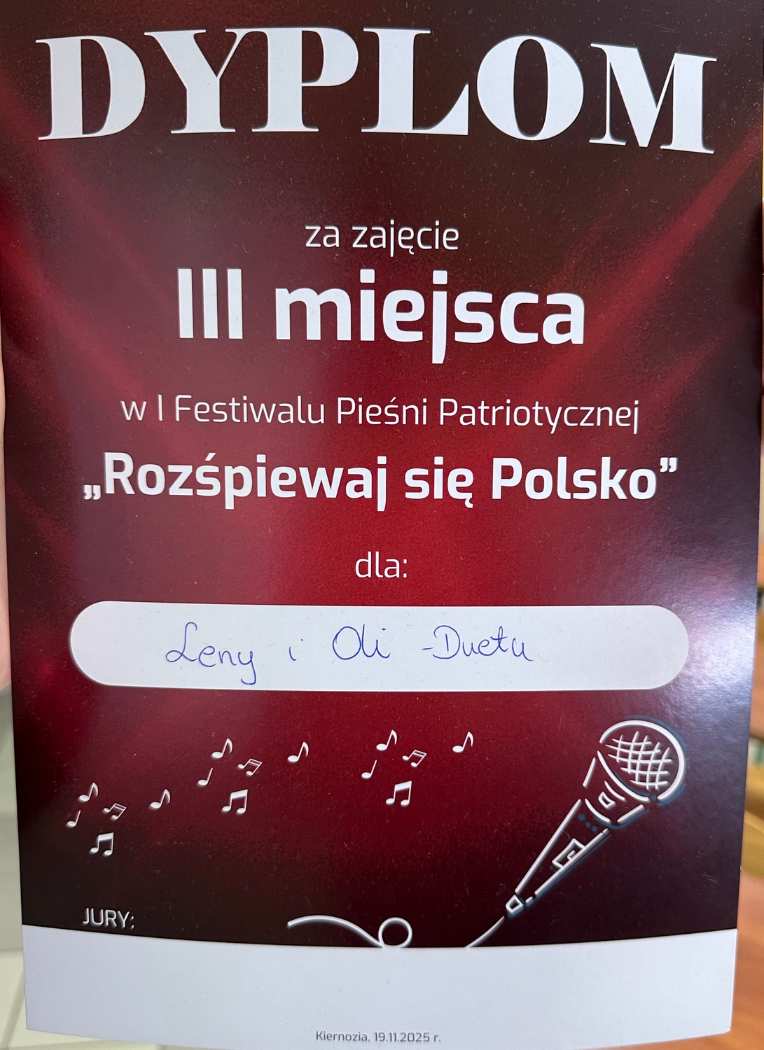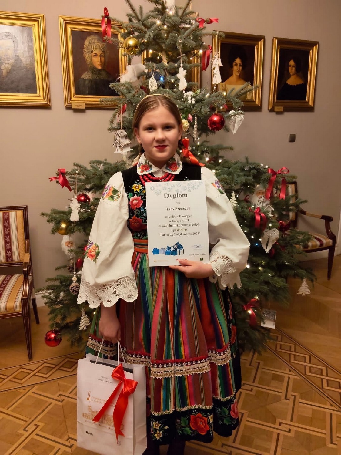 W środę, 3 grudnia 2025 roku, w sali koncertowej Europejskiego Centrum Artystycznego im. Fryderyka Chopina, odbył się konkurs „Pałacowe Kolędowanie”. Zgromadził on utalentowanych uczestników śpiewających kolędy i pastorałki w różnych kategoriach wiekowych. Nasza uczennica Lenka Szewczyk została doceniona przez jury i zdobyła II miejsce w kategorii klas V-VIII. Uroczyste wręczenie nagród odbyło się w dniu 14 grudnia.