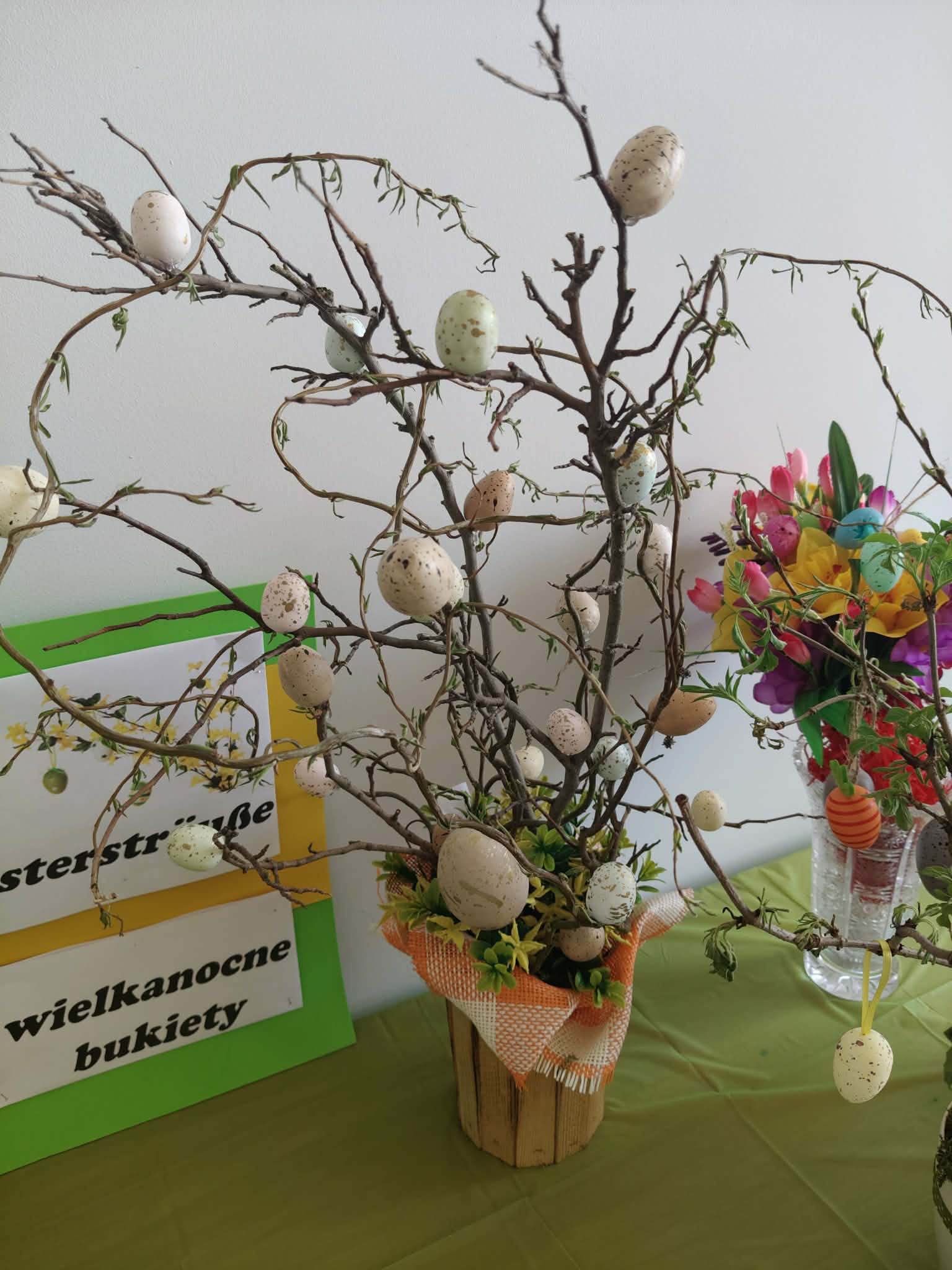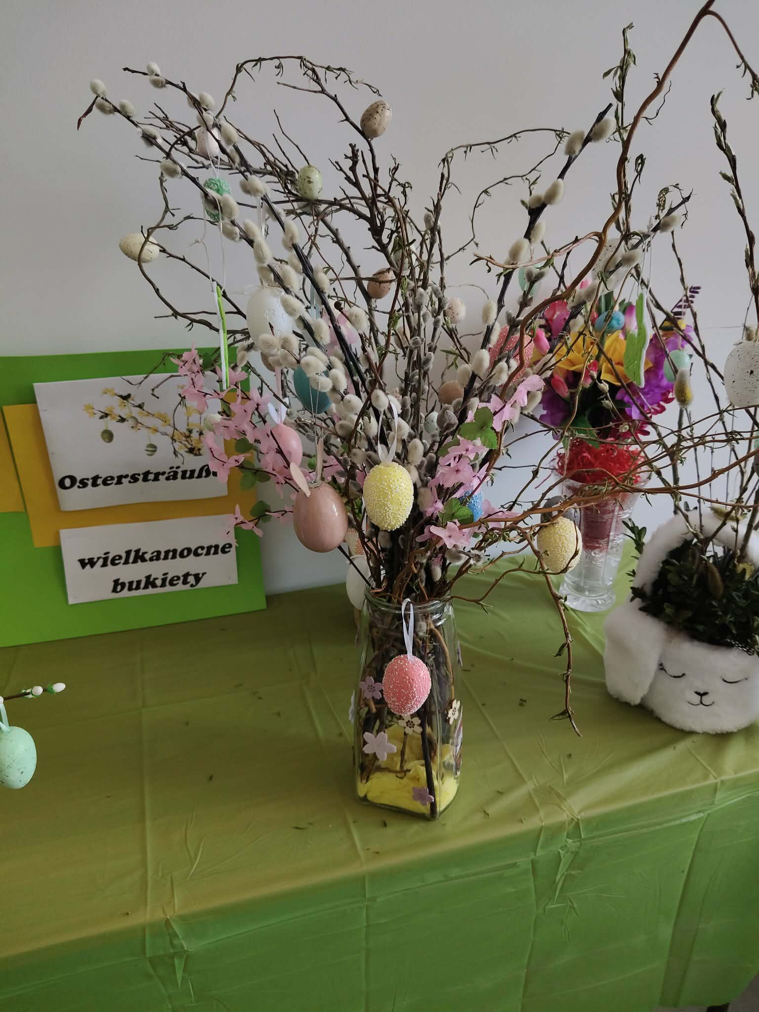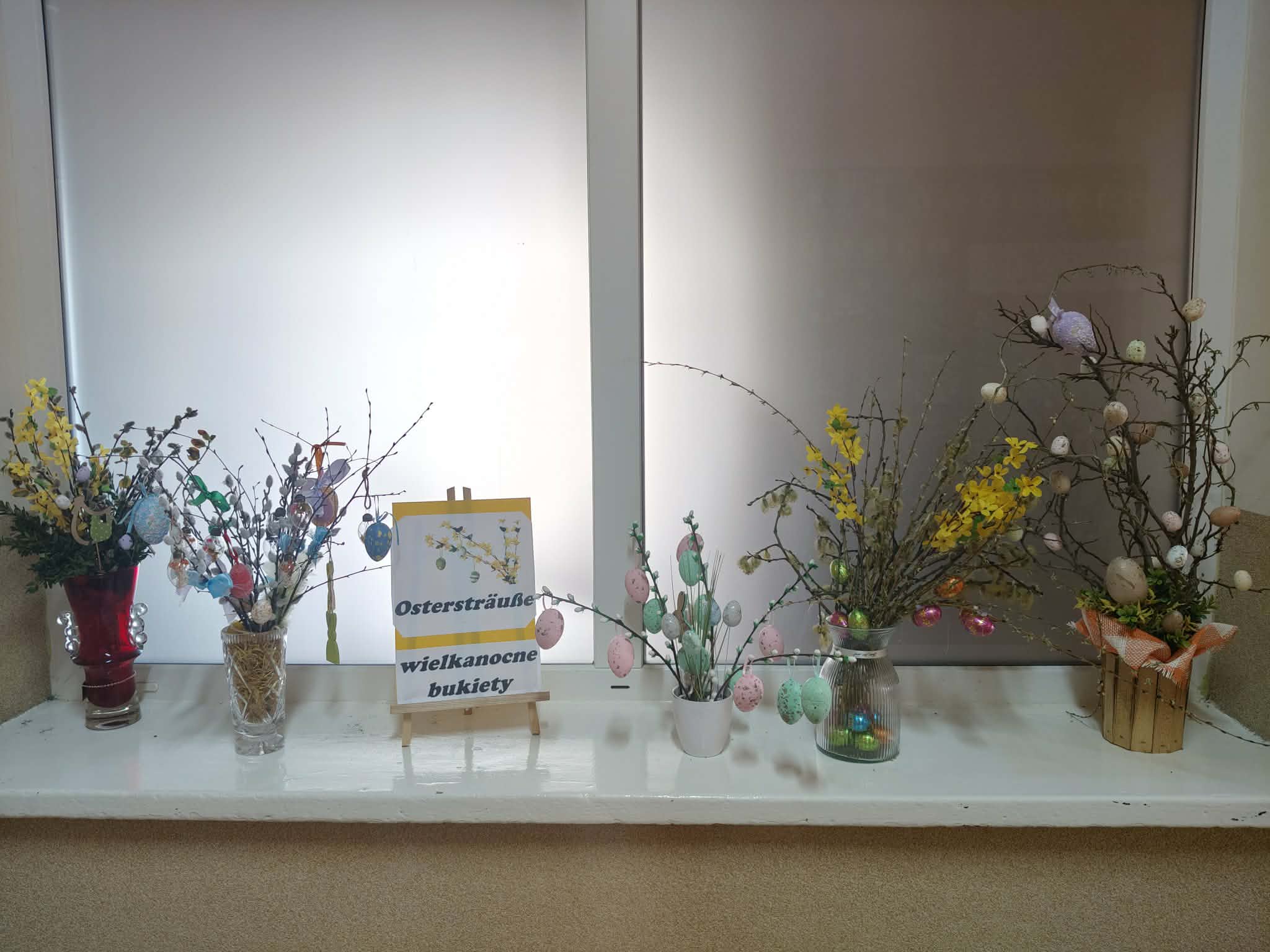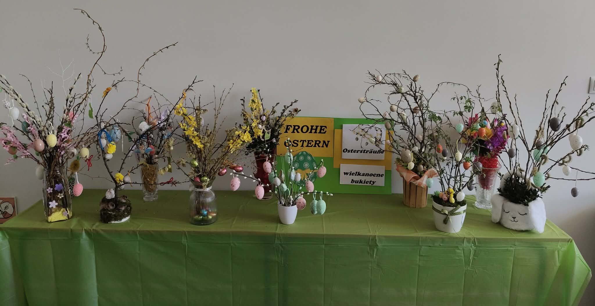 Bukiety wielkanocne (z niem. Ostersträuße)to tradycyjna ozdoba niemieckich domów, wykonane z zielonych gałązek przystrojonych kolorowymi wydmuszkami i symbolami świątecznymi. W ostatnim tygodniu przed świętami uczniowie klasy VII wykonali własnoręcznie bukiety wielkanocne. Pomysł stworzenia bukietów wielkanocnych przez uczniów był elementem poznawania tradycji związanej ze Świętami Wielkanocnymi w krajach niemieckojęzycznych. Prace uczniów urzekały pomysłowością i oryginalnością. Dzięki wyeksponowaniu przygotowanych prac na wystawie wszyscy poczuliśmy magię zbliżających się Świąt Wielkanocnych.