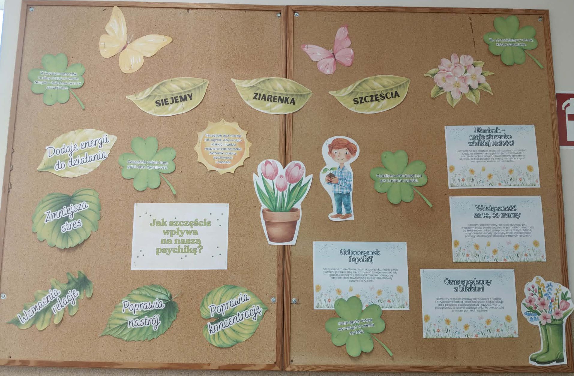 27 marca w naszej szkole zorganizowany został Dzień Szczęścia. Była to okazja do podejmowania tematów, które są elementami składowymi modelu szczęścia: dbanie o pozytywne uczucia, zaangażowanie, relacje, poczucie sensu, osiągnięcia i zdrowie. W ramach wydarzenia została opracowana gazetka szkolna na temat: „Siejemy ziarenka szczęścia”. W szkole pojawiła się Skrzynka Szczęścia, do której uczniowie mogli wrzucić „Koniczynkę wdzięczności”- z miłym słowem zaadresowaną do kolegów, koleżanek lub pracowników szkoły. Uczniowie klas I-III ubrali się tego dnia na zielono. W ramach zajęć wysłuchali bajki pt. „Pudełko Pani Radości”. Dzięki przygodom bohaterów bajki uczniowie odkryli, jak odnaleźć radość w codziennych, prostych rzeczach i w sobie samych. Uczniowie klasy VII wzięli udział w lekcji na temat: „Szczęście – jak wpływa na naszą psychikę?” Podczas zajęć uczniowie uświadomili sobie, że szczęście jest trochę jak ogród. Aby mogło rosnąć, trzeba najpierw zasiać małe ziarenka dobra, życzliwości i radości. Udział w obchodach Dnia Szczęścia był doskonałą okazja, aby przypomnieć uczniom, jak ważne jest dbanie o zdrowie psychiczne i emocjonalne na co dzień.