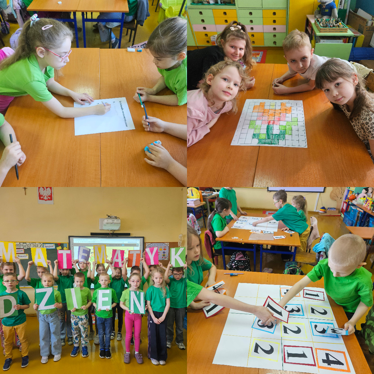 Uczniowie klas I–III wzięli udział w matematycznych rozgrywkach, podczas których mieli okazję rozwijać swoje umiejętności liczenia, logicznego myślenia oraz rozwiązywania zadań. Dzieci ćwiczyły dodawanie, odejmowanie, rozpoznawanie figur geometrycznych oraz orientację w przestrzeni. Wszystko odbywało się w formie zabawy, dzięki czemu nauka była przyjemna i angażująca. Uczniowie chętnie współpracowali w zespołach, a radości i śmiechu nie brakowało przez całe wydarzenie.